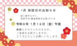 令和8年1月16日(金)午後は、院長が審査委員会出席のため 午後休診となります。 なお、午前中は通常通り診療いたします。 ご迷惑をおかけいたしますが、何卒ご了承ください。 なお年末年始の休診日は、こちら をご参照ください […]